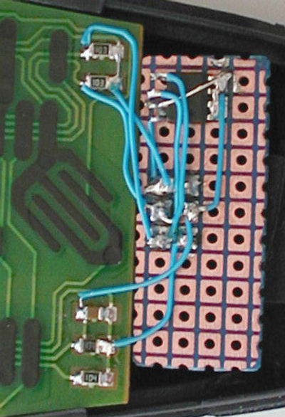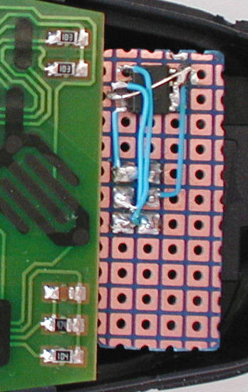 I wired up the 6 pin connector and 24AA16 EEPROM on a bit of patchboard cut to size so it fits neatly in the Sky remote case. As the EEPROM I used was a surface mount part, the pitch of the PCB squares was wrong. Carefully bend up pins 6 and 7 so they clear the PCB - you can then solder the wires directly to them. |