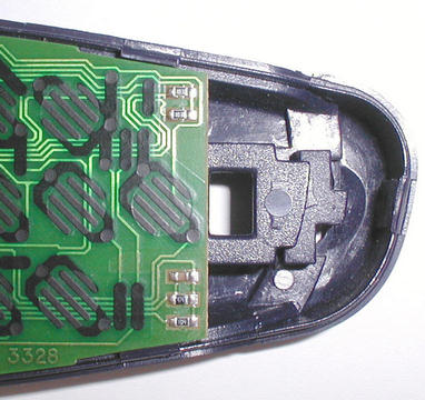 There are at least two variations of the Sky Digital remote control. Some versions have spaces on the circuit board for a 6 pin header and some don't. Remove the battery cover and look at the bottom of the remote control. If you can see a PCB with 6 holes, yours also has the space on the PCB for the EEPROM and won't need an extra board. This remote pictured is an RC1600/00 model which doesn't, but it's pretty easy to add. Importantly, the case already has a space for the 6 pin connector. |